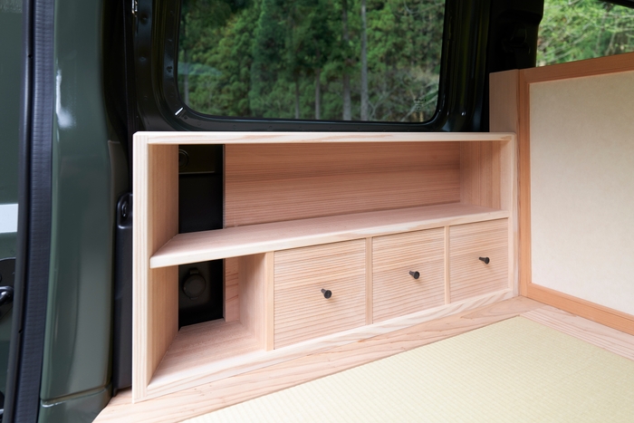 左右の棚は、京都の杉で柾目を使用。湿気がこもりやすい車内でも木の収縮による狂いを少なくするための工夫です。シガーソケットにIHコンロなどをつなぐことで出先でもお湯を沸かし一服をお楽しみいただけます。