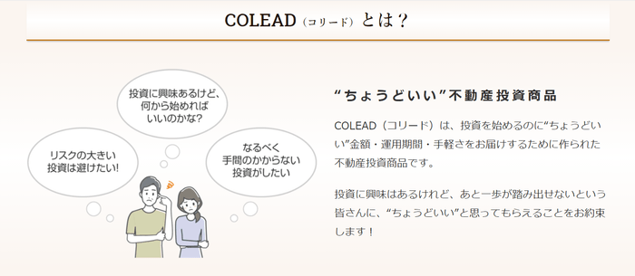 COLEADは1口50~100万円から出資可能とすることで、不動産投資の敷居を下げ、より多くの方に始めて頂きやすい不動産小口化商品を目指しました。