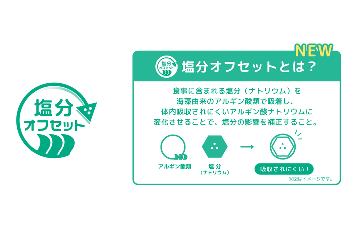 当社が独自に開発したこの「塩分オフセット技術」は、海藻由来の食物繊維アルギン酸類を用い、食事中の塩分(ナトリウム)を胃の中で吸着し、吸収しにくい形に変えて、最終的に便として排出するという新しいメカニズムに基づいています。これにより、味を変えることなく、実質的に“減塩”の効果を得ることが可能です。またカリウム制限のある方にも安心してご使用頂くことができます。気にせんべいと零シリーズはどちらもこの技術を用いて作られた商品です。