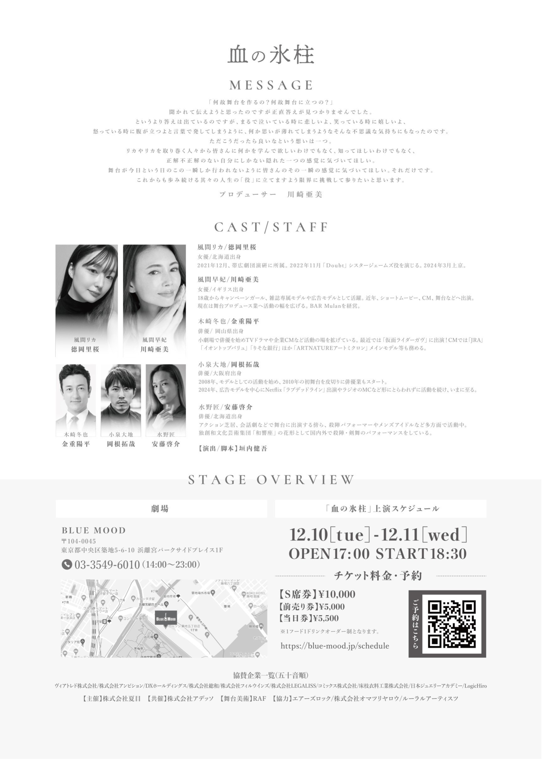 この冬、舞台「血の氷柱」観劇によって皆さん各々の胸に湧き上がる一瞬の感覚感情に気づき、また明日からの人生の歩みに少しでも良い影響を齎すことができれば幸いです。