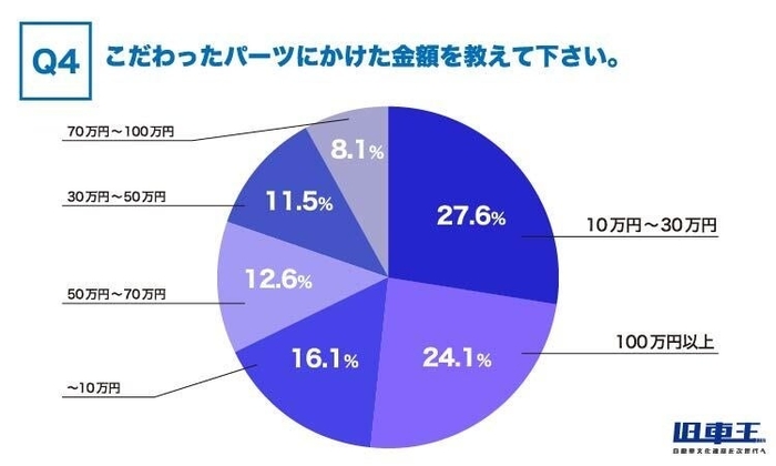 こだわったパーツにかけた金額は、10万円以下から100万円以上まで幅広く分布している。 パーツにこだわらなかった人のうち、7割がオリジナルの状態を好むからと回答。
