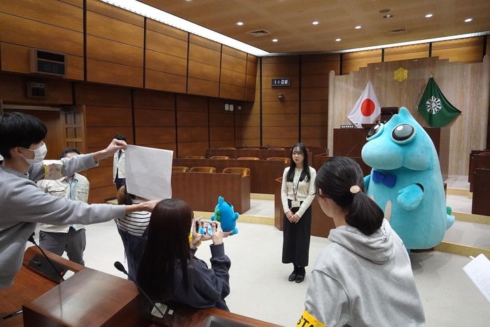 そして、2025年1月に日進市役所で撮影を実施。監督、カメラ、出演者、裏方など、各々が役割を持って臨みました。現場での試行錯誤もあったようです。「画角やピントの合わせ方を考えて撮影した」とカメラ役の中田さん。「キャラクターの動きの大きさ、しゃべり方を工夫した」という森さん、伊藤さん、三並さん。「キャラクターを支えたり、小道具を用意したり」と進行をサポートした吉村さん。見やすく、伝わりやすい動画にするためにあれこれ模索しました。綿密な準備のおかげもあって撮影はスムーズに終了。約1ヶ月半かけて編集され、動画が完成しました。
