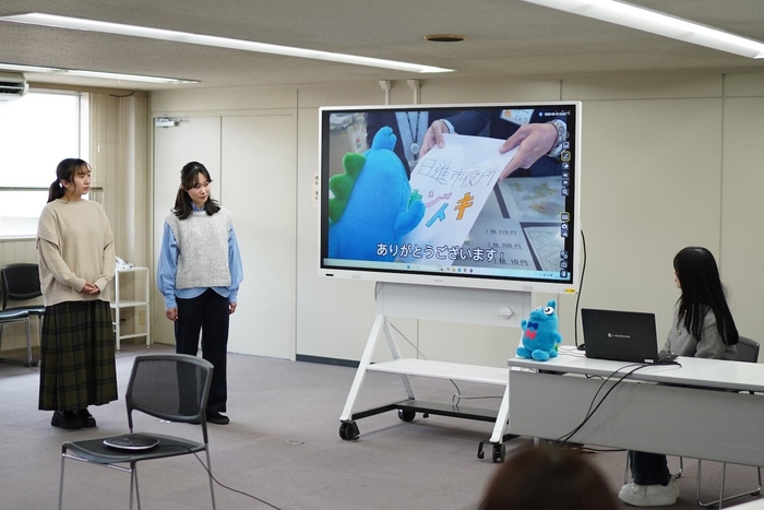 学生たちからは、企画、撮影、編集で工夫した点などが紹介されます。編集では、テロップの文字や効果音にもこだわりました。「使用する漢字は、市役所見学時点で学習しているかすべて確かめました。ちょっとした音のあるなしで見え方がガラッと変わって。いろいろと試してみるのが面白かったです」と恵島さん。