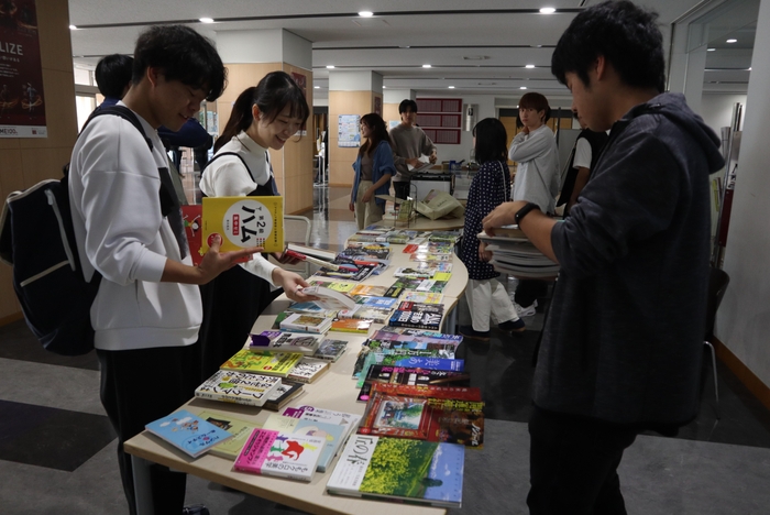 東日本大震災で大きな被害を受けた岩手県陸前高田市の復興支援に取り組み、「Enjoy Learningプロジェクト」に採択されている学生団体「Book-aid」が10月19日、天白キャンパスの共通講義棟北で、学内などで回収した古本や陸前高田市で仕入れた物産品を販売しました。