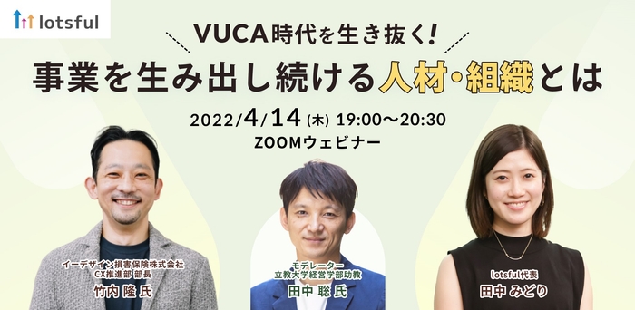 総合人材サービス、パーソルグループのパーソルイノベーション株式会社(本社:東京都港区、代表取締役社長:長井 利仁)が運営する副業人材マッチングサービス「lotsful(ロッツフル)」(https://lotsful.jp/)は、2022年4月14日(木)19:00から「VUCA時代を生き抜く!事業を生み出し続ける人材・組織とは」をテーマにオンラインセミナーを開催します。