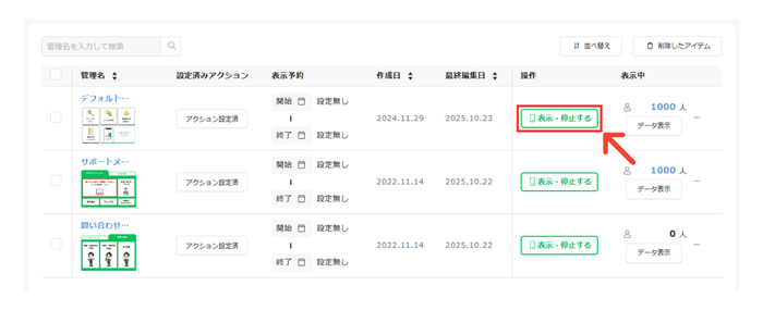 今回のアップデートでは、リッチメニューの表示・停止をリッチメニュー管理画面から直接行えるようになりました。