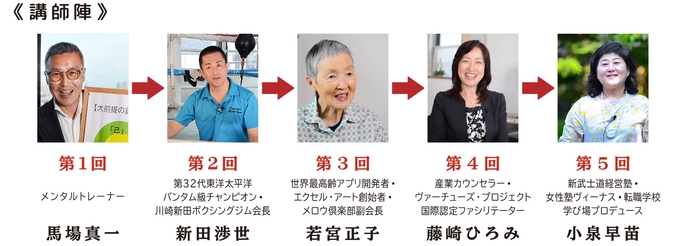 「メンタルトレーナー」の馬場講師、「初の国立大卒王者」として話題となった新田講師、アップルCEOから「世界最高齢のアプリ開発者」と紹介された若宮講師、「応援力」を講演・研修などで発信している藤崎講師、対談動画の「YouTube」を配信し続けている小泉講師とバラエティにとんだ講師が揃っています。