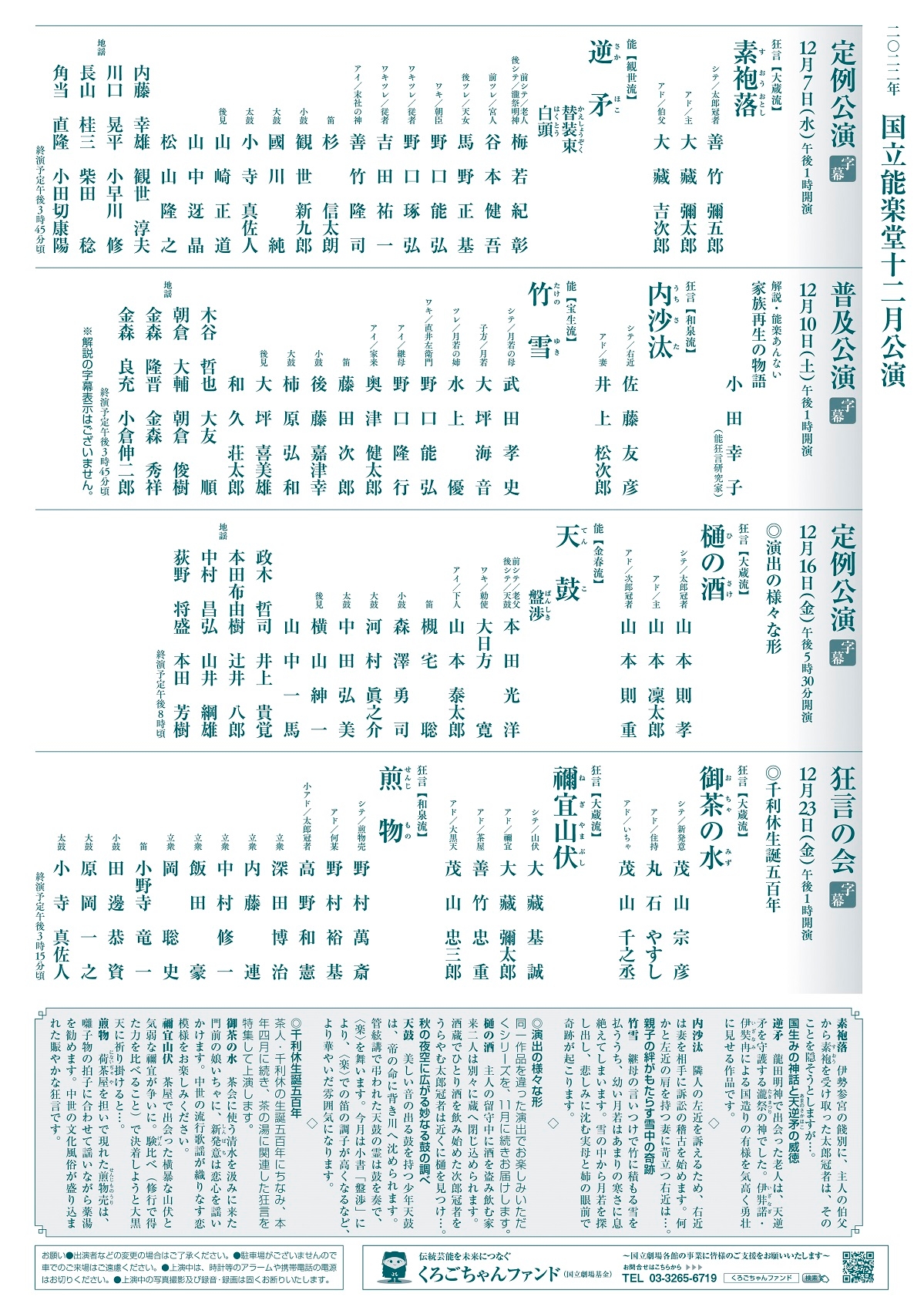 国立能楽堂(東京都渋谷区千駄ヶ谷4-18-1)の12月主催公演が下記の通り上演されます。