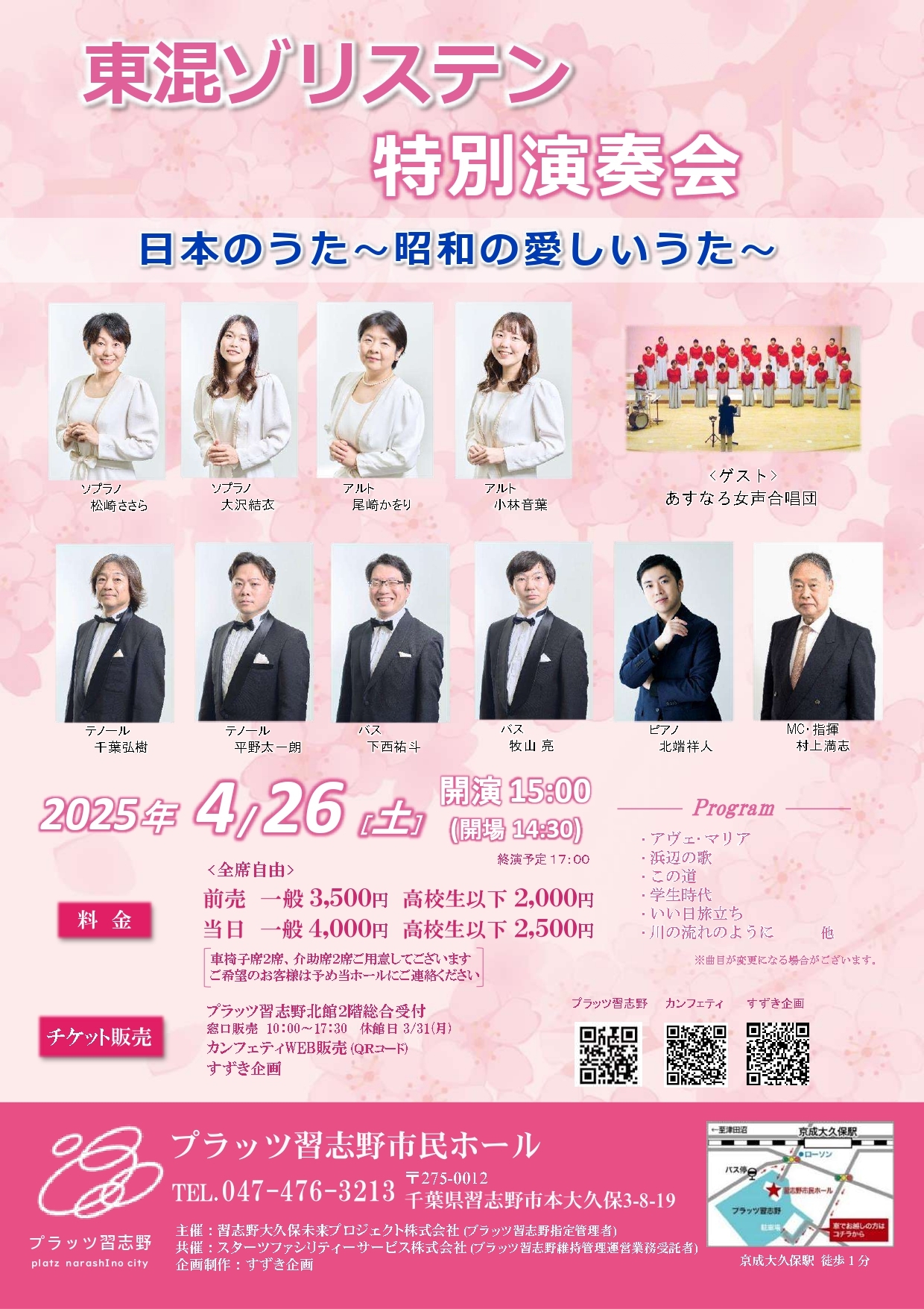 『東混ゾリステン 特別演奏会 日本のうた~昭和の愛しいうた~』が2025年4月26日 (土)に習志野市民ホール(千葉県 習志野市 本大久保 3丁目8−19 プラッツ習志野)にて開催されます。チケットはカンフェティ(運営:ロングランプランニング株式会社、東京都新宿区、代表取締役:榑松 大剛)にて発売中です。