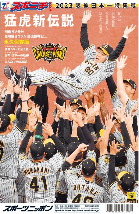 スポーツニッポン新聞社は「2023阪神日本一特集号」を明日7日から順次発売します。豪華グラフ集で振り返るクライマックスシリーズから「関西シリーズ」の軌跡に、日本一達成当日配布した特製号外、「スポニチTIGERS フォト」で募集した「応援写真」も可能な限り掲載しました。タブロイド判28ページ、オールカラーで定価は600円(税込み)。駅売店、コンビニ(一部店舗除く)などで販売します。また、Amazon、HMV&BOOKS online、ヤフーショッピングスポニチ大阪、毎日新聞販売店などでご注文ください。お問い合わせは(電)0120(4612)10まで