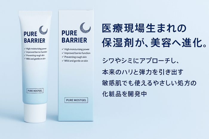 テープかぶれ予防や手荒れ予防として15年間医療で使われてきた製品「ピュアバリア」を“しわ・シミ・たるみ”などのお肌の悩みにフォーカスした美容向けに進化させ、本来のハリと弾力を引き出す敏感肌でも使える高機能処方の化粧品を開発中です。