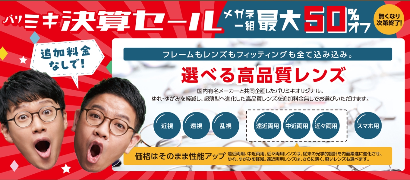 選べる高品質レンズ付き、メガネ1組最大50%OFFコーナーをご用意。無くなり次第終了となりますので、お早目にお近くのパリミキまでご来店ください!