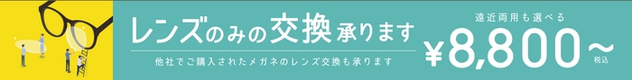 遠近両用、超薄型単焦点レンズが2枚1組 税込¥8,800より、他社でご購入のメガネのレンズのみの交換も承りますので、どうぞお気軽に近くのお店にご来店ください。