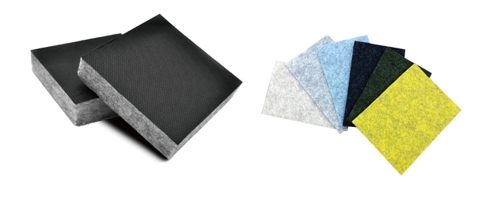 材料には高性能吸音材QonPET(キューオンペット)と同じ吸音材を使用。QonPET特有の高い吸音性能を発揮する独自の2層構造を意匠性のあるフェルトで再現。最大10dB以上の周囲との音の低減効果を発揮し、工業用途で培った技術と知識を活かした、リブグラフィだから出来た商品です。