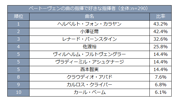 最後にベートーヴェンの曲で好きな指揮者を聞いたところ、「ヘルベルト・フォン・カラヤン」がトップ、次に僅差で「小澤征爾」となりました。