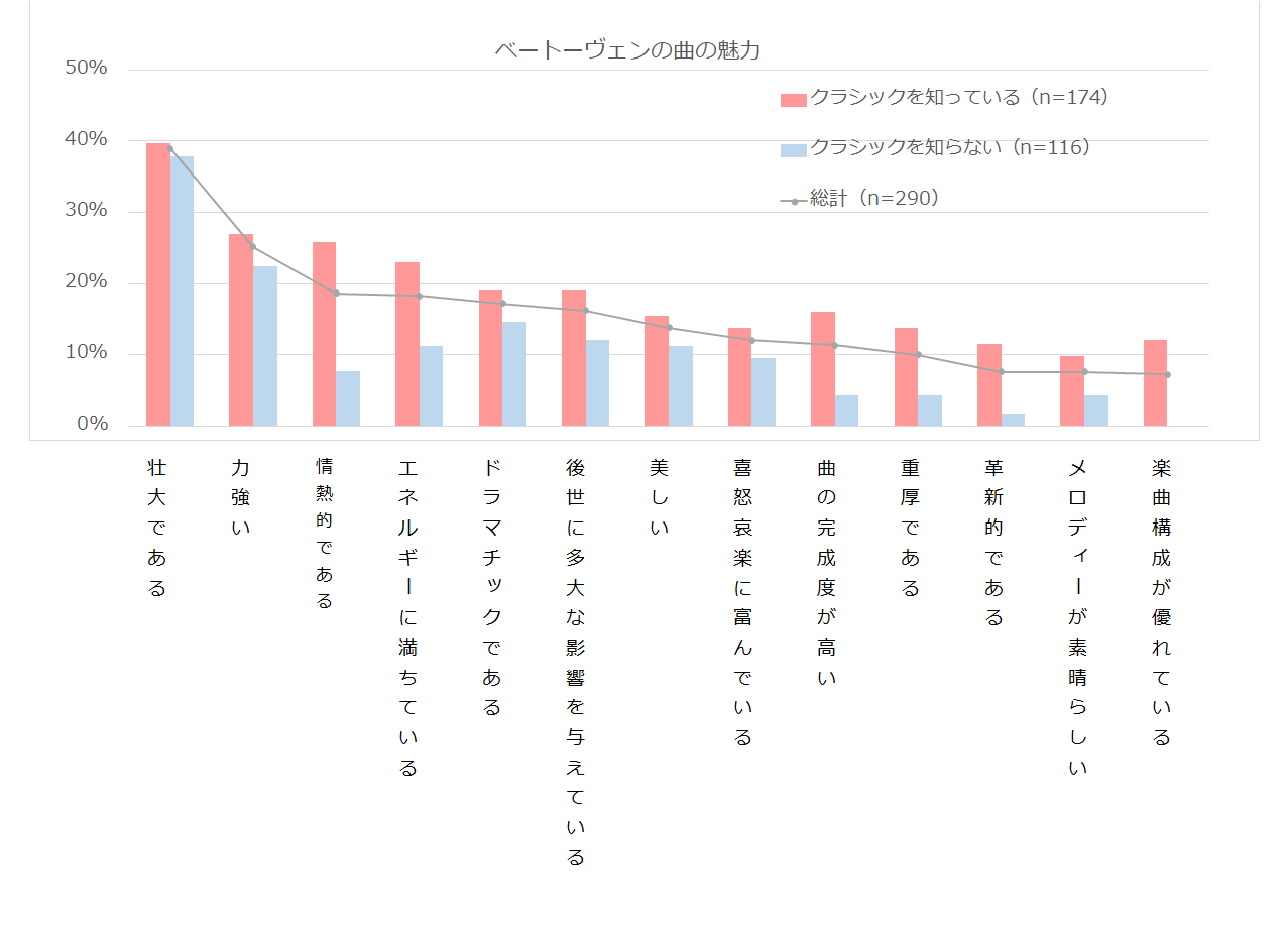 まず、ベートーヴェンの曲の魅力は「壮大である」「力強い」が上位となりました。やはり、ベートーヴェンはスケールの大きさや力強さが評価されているようです。また、クラシックを知っているかどうかで評価項目に差があり『クラシックを知っている』人は、知らない人より、「曲の完成度が高い」「楽曲構成が優れている」が高くなり、音楽面での評価が高いことが伺える結果となりました。
