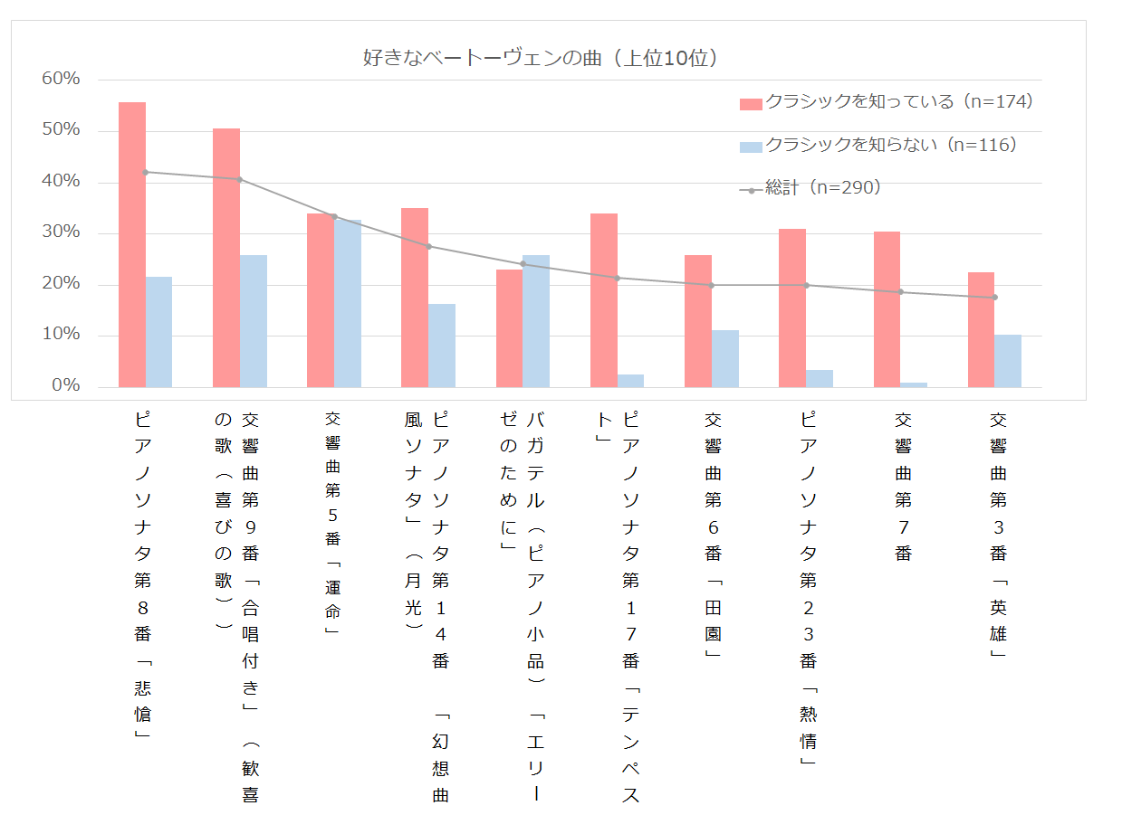 続いて、好きなベートーヴェンの曲を聞いたところ、全体では、「ピアノソナタ第8番「悲愴」」「交響曲第九番「合唱付き」(歓喜の歌(喜びの歌))」「交響曲第5番「運命」」がトップ3となりました。