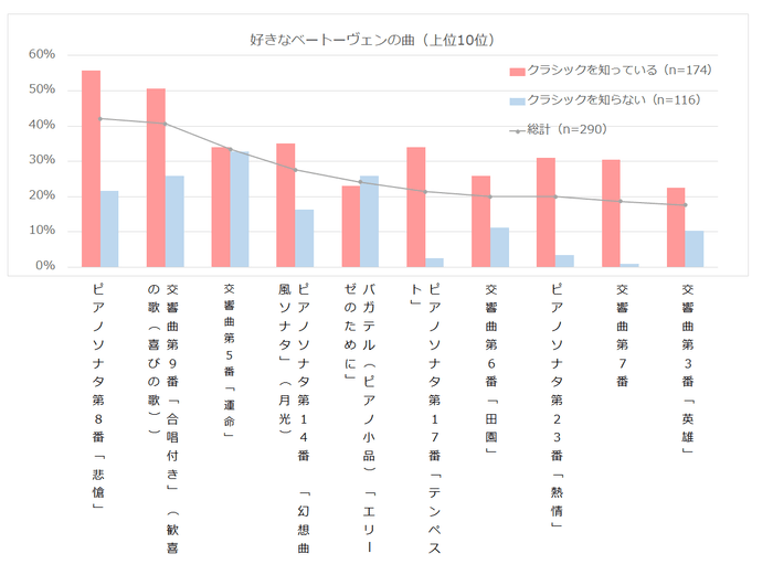 一方、『クラシックを知っている』では「ピアノソナタ第8番「悲愴」」「交響曲第9番「合唱付き」(歓喜の歌(喜びの歌))」「ピアノソナタ第14番 「幻想曲風ソナタ」(月光)」となりました。その中でも「ピアノソナタ第8番「悲愴」」は『クラシックを知らない』より大きく差をつけています。