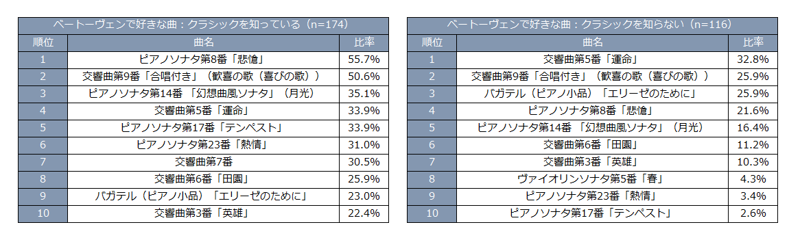 しかし、クラシックの認知度別で聞いてみると大きな違いが見られました。『クラシックを知らない』では、「交響曲第5番「運命」」「交響曲第9番「合唱付き」(歓喜の歌(喜びの歌))」「バガテル(ピアノ小品)「エリーゼのために」」と誰もが知っている有名な曲が上位にきました。