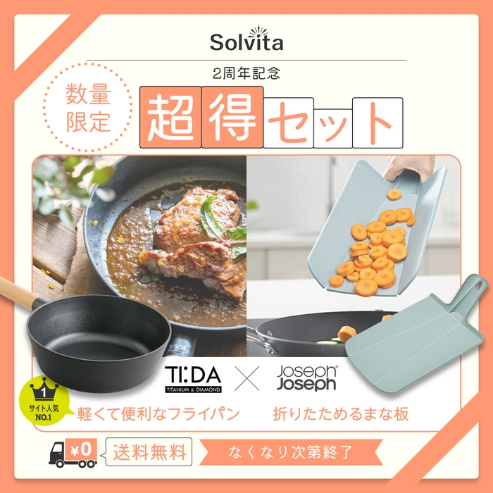 軽くて使いやすいフライパン『TI:DA(ティーダ)』と人気英国ブランドJoseph Joseph(ジョセフジョセフ)の便利なおりたたみまな板のセットは、なんと、フライパン1個の値段でまな板もゲットできる超得セットとなっております。