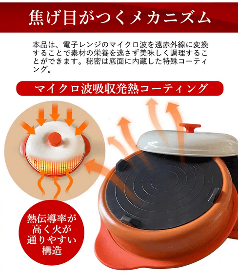 電子レンジで加熱するだけで、フライパンで焼いたような美しい焼き目がつきます。特殊なセラミック素材がマイクロ波を吸収し、鮮やかな焼き色とカリっとした食感を実現します。油はねや煙、臭いなし