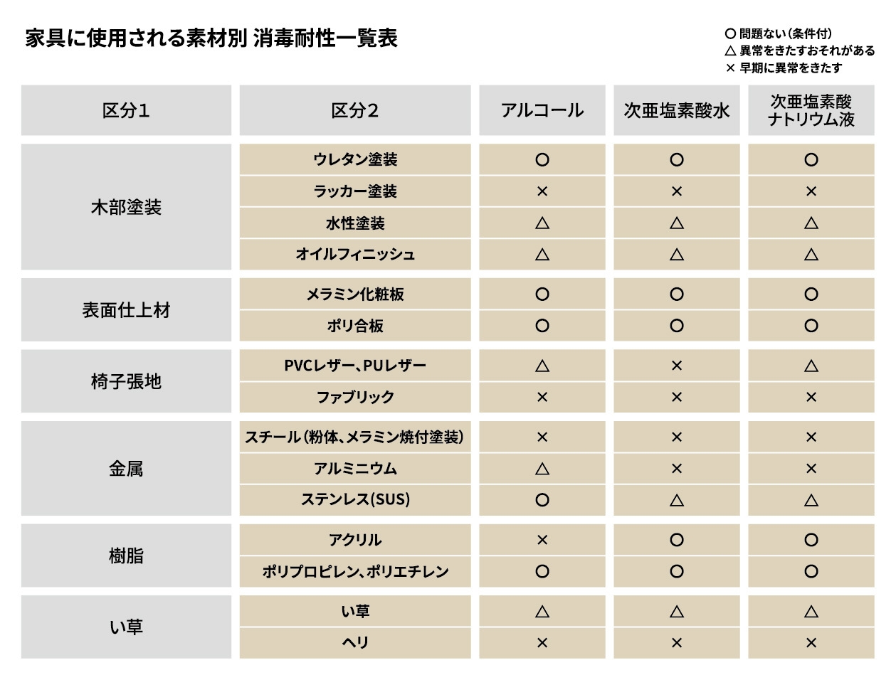 しかし、強力な消毒液により一度変色や劣化を起こすと素材を修復することは難しい為注意が必要です。当社の家具で採用している主な素材・塗料メーカー10社以上の見解を基に、各素材・塗装別の消毒耐性についてまとめました。