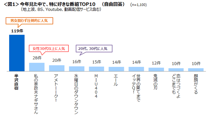TOPの「半沢直樹」に加え、2位の「私の家政夫ナギサさん」、5位の「MIU404」、6位「エール」など、ドラマがTOP10に6本ランクイン。「鬼滅の刃」についてはレギュラー放送は昨年だったが、特別編集版の放送や各種動画配信サービスで配信されていることもあり、8位にランクインしている。<図1>