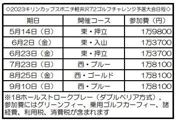爽やかなリゾートゴルフが満喫できる軽井沢72ゴルフで「2023キリンカップ スポニチ軽井沢72ゴルフチャレンジ」を、別表の通り開催します。各予選大会の上位26人は、日本女子プロゴルフツアー「NEC軽井沢72ゴルフトーナメント」で知られる北コースでの決勝大会(10月22日開催)に出場できます。