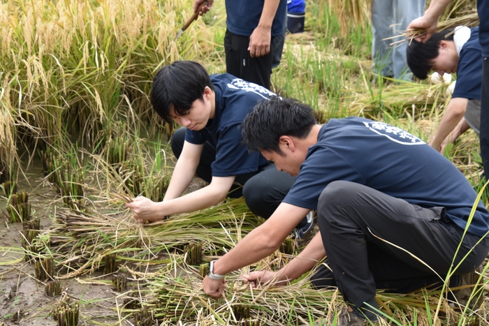 学生や教職員、附属高校生ら約220人が参加 稲刈り作業に汗を流す