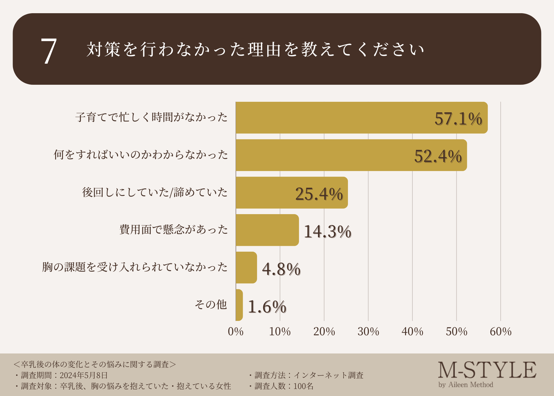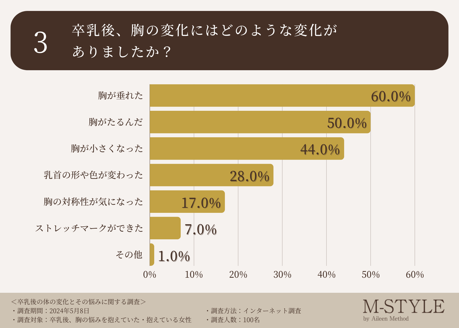 アイリーン式育乳マッサージで一躍有名となった美容家「神長アイリーン」が所属するバストアップ専門エステティックサロン「M-STYLE( https://ay-company.com/ )」は、卒乳後、胸の悩みを抱えていた・抱えている女性を対象に卒乳後の体の変化とその悩みに関する調査を実施しました。