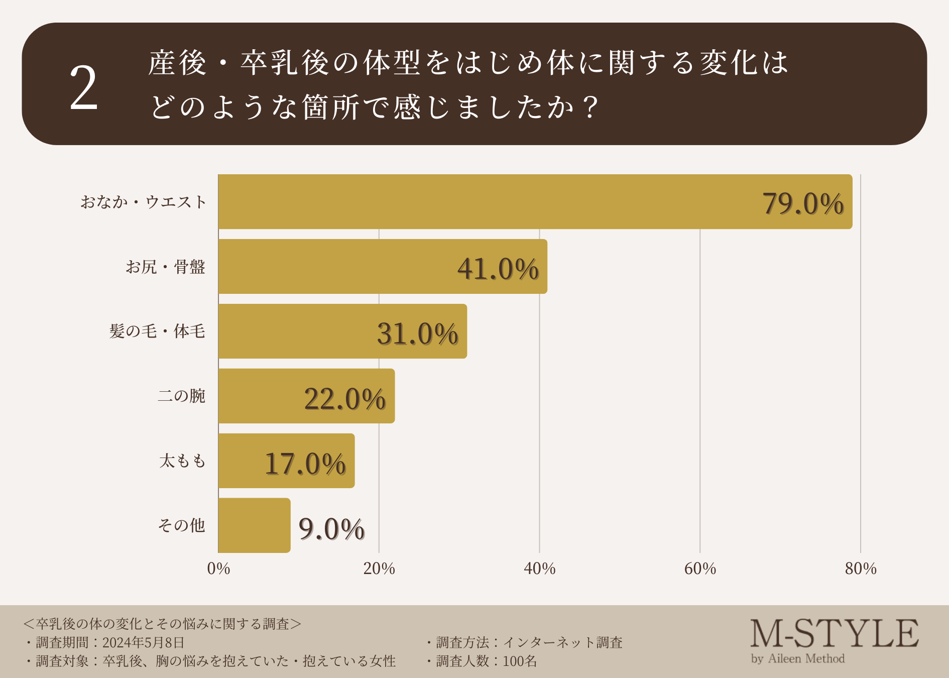 そこで、産後・卒乳後の体型をはじめ体に関する変化は胸以外にどのような箇所で感じたのか伺ったところ、「おなか・ウエスト(79.0%)」「お尻・骨盤(41.0%)」「髪の毛・体毛(31.0%)」という回答が集まりました。