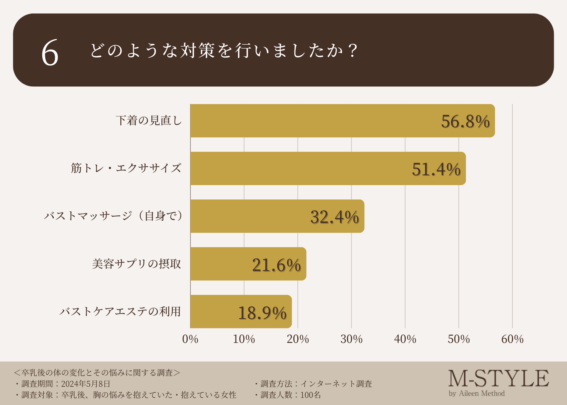 次に、どのような対策を行ったのか伺ったところ、「下着の見直し(56.8%)」「筋トレ・エクササイズ(51.4%)」「バストマッサージ(自身で)(32.4%)」という回答が集まりました。