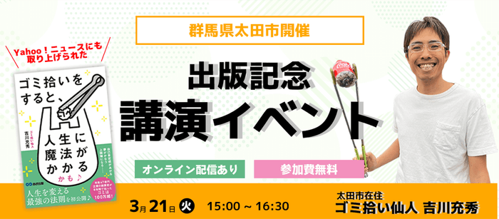 株式会社あさ出版(代表取締役:田賀井弘毅、所在地:東京都豊島区)は『ゴミ拾いをすると、人生に魔法がかかるかも♪』http://www.asa21.com/book/b615374.html著者の吉川充秀氏が、2023年3月21日(火) に群馬県太田市にて出版記念講演イベントを開催することをお伝えいたします(Youtube配信も有)。