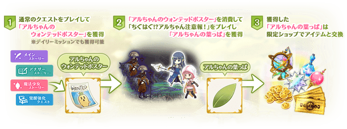 「アルちゃんのウォンテッドポスター」を消費すると本イベントのクエストをプレイでき限定アイテムや覚醒素材と交換できる「アルちゃんの葉っぱ」を獲得できます。