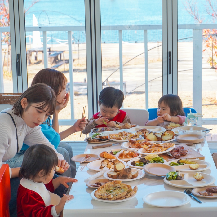 ●地域のママが考案!子連れでも楽しめるBBQメニュー。子どもたちが好きなピザやポップコーン、焚火体験付の特別プラン
