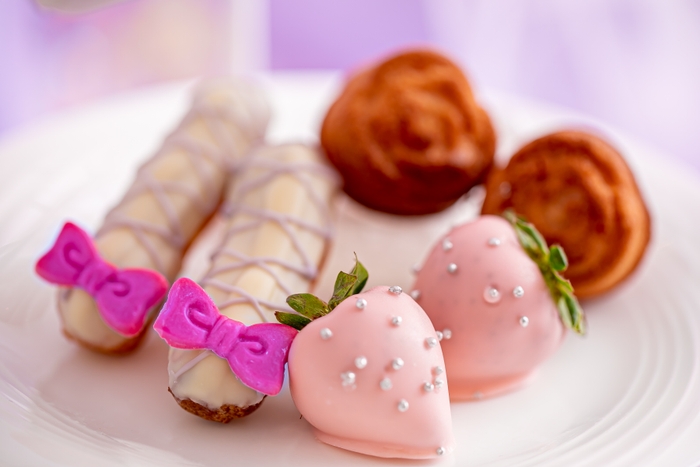 はじめに登場するのは、淡いパープルのドレスをまとったプリンセスのドールケーキ。そして三段のスイーツスタンドには、パステルカラーのマカロンや可愛らしいリボンをアイコンにしたエクレア、淡いピンクのチョコレートでディップしたいちご、プリンセスモンブランなどをご用意。さらにクロワッサンサンドなど3種の色鮮やかな軽食を、プリンセスドリンク(オリジナルソフトドリンク)などのフリーフローとともにご堪能いただけます。