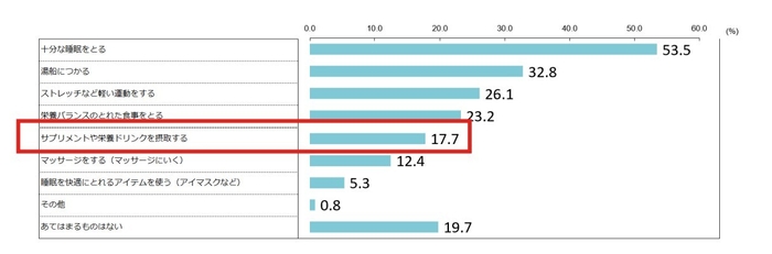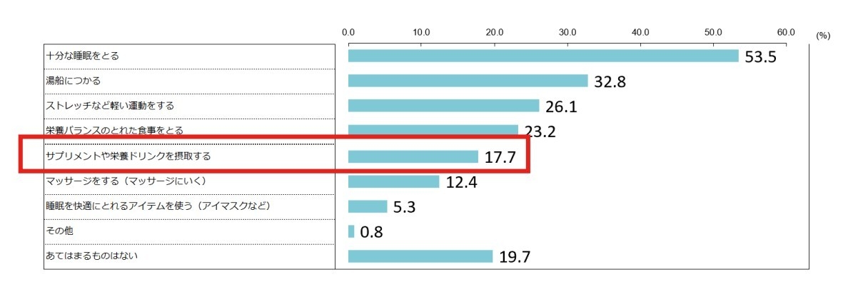 疲れへの対処として、基本的な睡眠や入浴、食事以外に、サプリを摂取するという栄養面で、+αの対処まで行えているのは17.7%と、一部のみにとどまる
