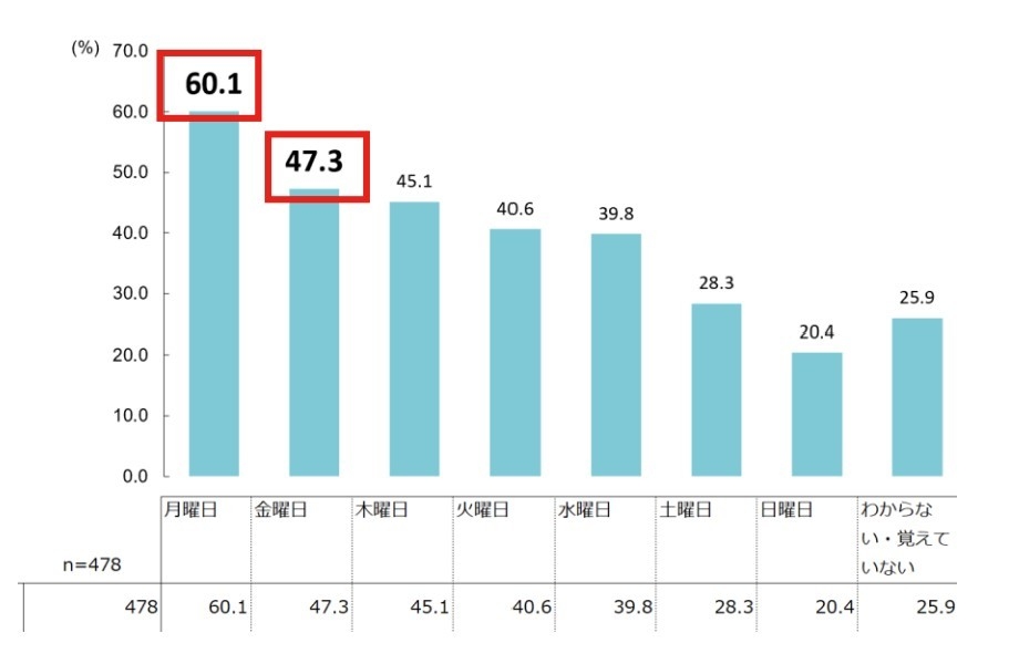 最も疲れを感じる曜日は月曜日と金曜日が上位2位を占める。週明けと週末に疲れが強い傾向に。