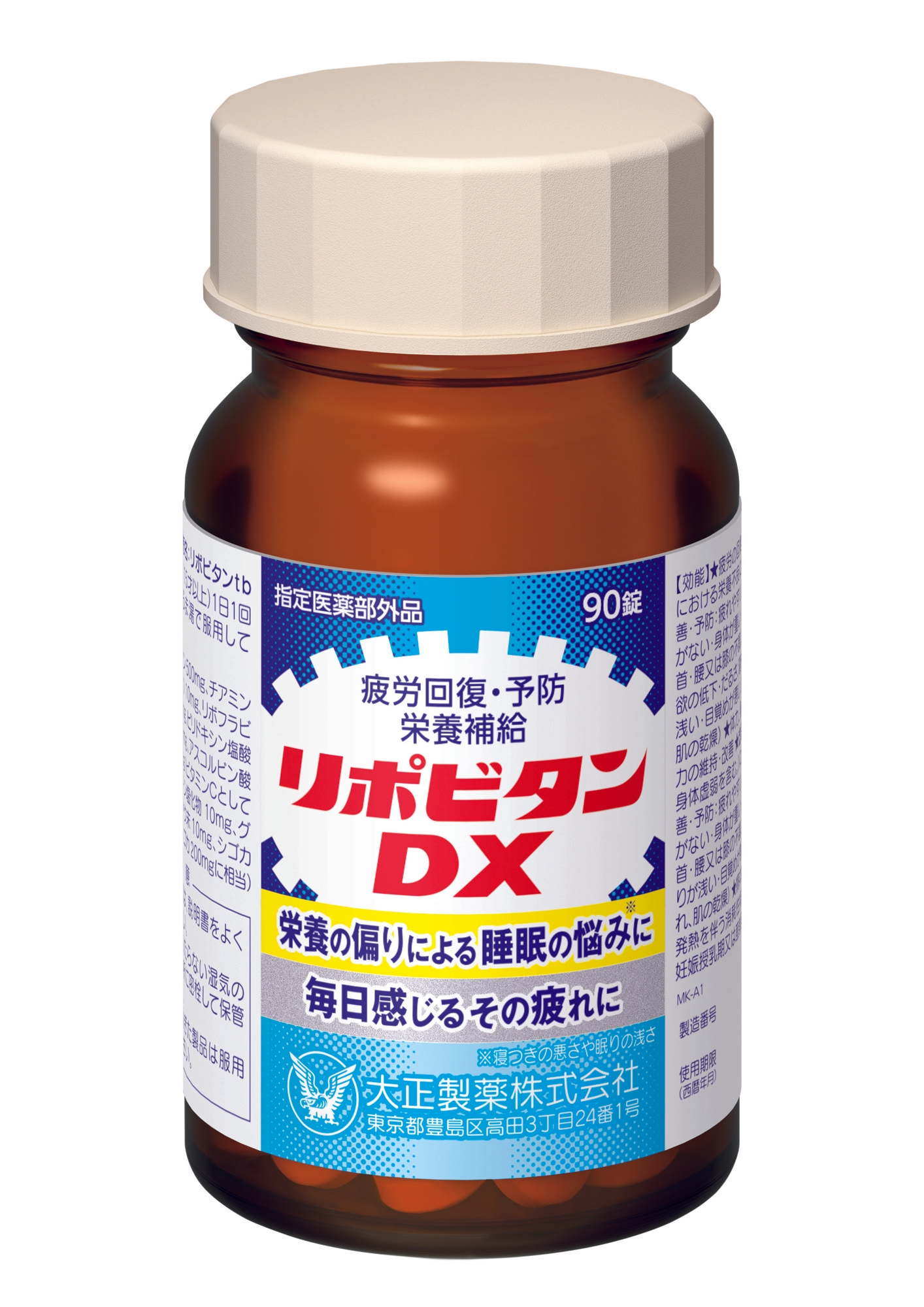 「リポビタンDX」は、「リポビタン(錠剤)」として発売されたブランド第一号製品以来の、約40年ぶりに登場した錠剤タイプの疲労回復を目的としたビタミン剤です。15才以上1日1回3錠の服用で、エナジーサイクルに働きかけるタウリン500mgやビタミンB1,B2,B6が摂取でき、またグリシンとシゴカの睡眠サポート成分を配合しているため、日々の生活で疲れを感じる方やしっかり寝たのに疲れが残る方におすすめの製品です。ノンカフェインで、おやすみ前の服用も考えて開発しております。