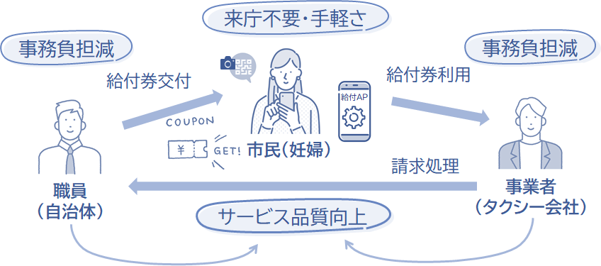妊婦向けのタクシー利用割引券を市役所等にお越しいただくことなくお渡しできることは、市民サービスの向上や事務負担の軽減につながると考えられます。