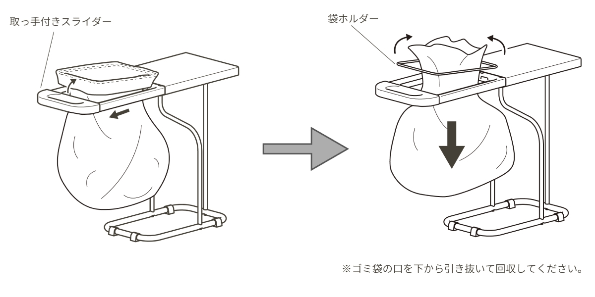 ①取っ手付きスライダーを最大まで引き出し、袋ホルダーを取り外す。
