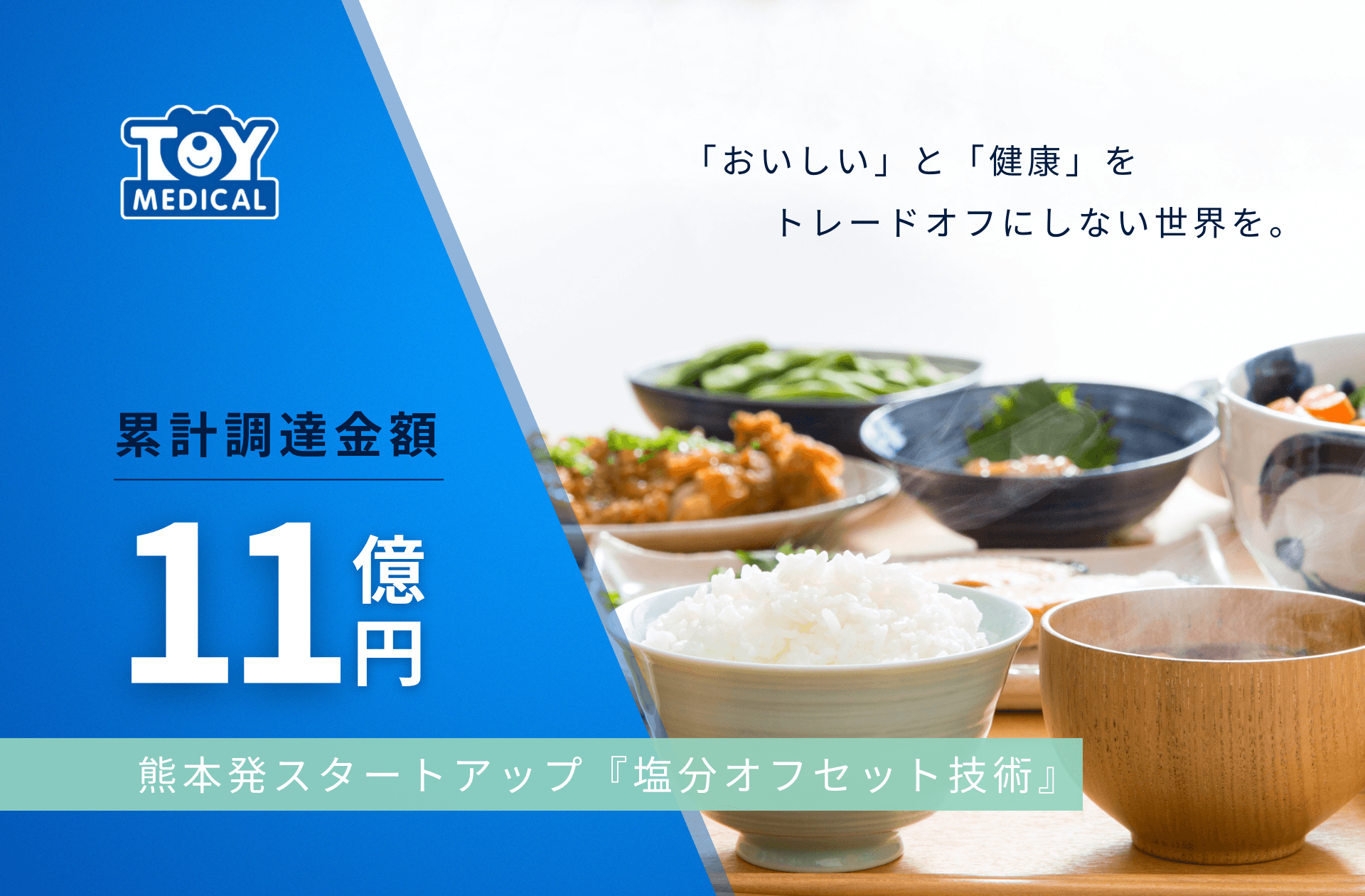 塩分の過剰摂取問題の課題解決に取り組むトイメディカル株式会社(本社:熊本県熊本市、代表取締役社長:竹下英徳)は、2025年10月、肥銀キャピタル株式会社(本社:熊本県熊本市、代表取締役:田島 功、以下、「肥銀キャピタル」)が運営する肥銀ベンチャー2号投資事業有限責任組合による第2回新株予約権の行使、ならびに株式会社再春館共創ラボラトリー(本社:東京都港区高輪)および東洋製罐グループホールディングス株式会社(本社:東京都品川区)を引受先とする第三者割当増資等により、総額3億円の資金調達を実施したことをお知らせいたします。これにより、当社の累計調達金額は11億円を超えました。