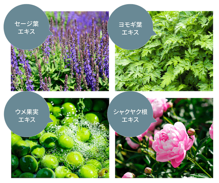 オウゴン根エキス、シャクヤク根エキス、セージ葉エキス