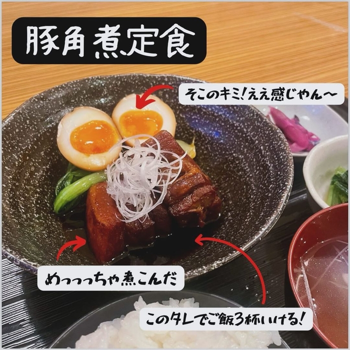 もう一つの看板メニュー、豚角煮は2日間じっくり仕込んだとろとろの角煮で、甘めのタレでごはんとの相性も抜群。しっかりとした旨みが口の中に広がり、箸が止まりません。