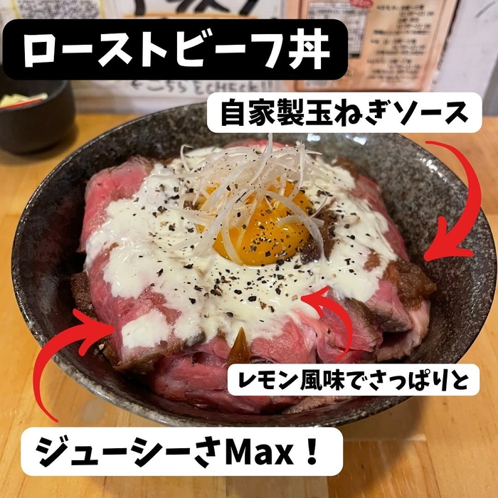 にく美のローストビーフ丼はジューシーなローストビーフに、自家製の甘めの玉ねぎソースと、爽やかなレモン風味のヨーグルトソースをご用意。お肉の旨みをしっかり感じながら、さっぱりと召し上がれます。