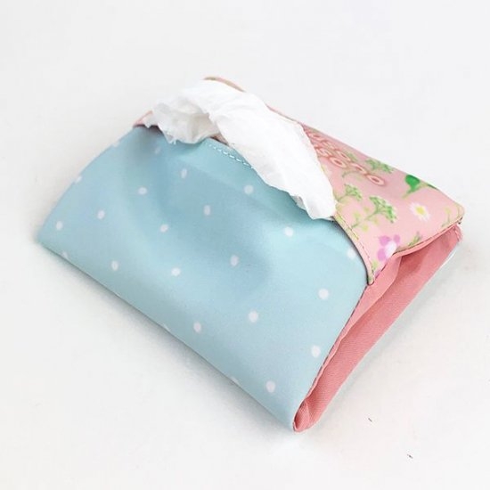 2つ折りにできて、片面がティッシュの取り出し口になっています。かわいいドット模様とお花柄のパターンで、パッチワークのようなデザインですね。