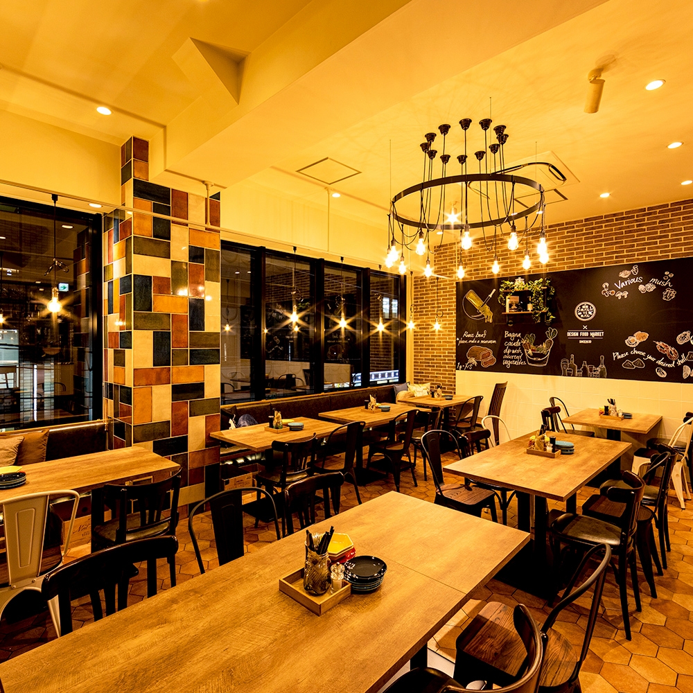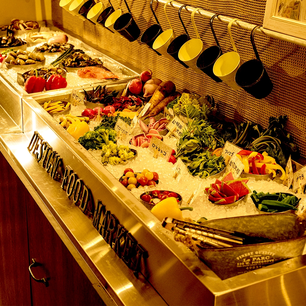 東京都新橋にある「DESIGN FOOD MARKET 新橋店」の2号店として、名古屋駅より徒歩2分の場所にオープン!店内に併設された「素材マーケット」には、こだわりのお肉や新鮮な魚介など、生産者から毎日届くとっておきの食材を豊富に取り揃えています。自社農園で心を込めて育てた野菜や、契約農家から届く栄養たっぷりの有機野菜は常時10種類以上ご用意。お好みの食材を見て、選んで、楽しめる、新感覚バルです。