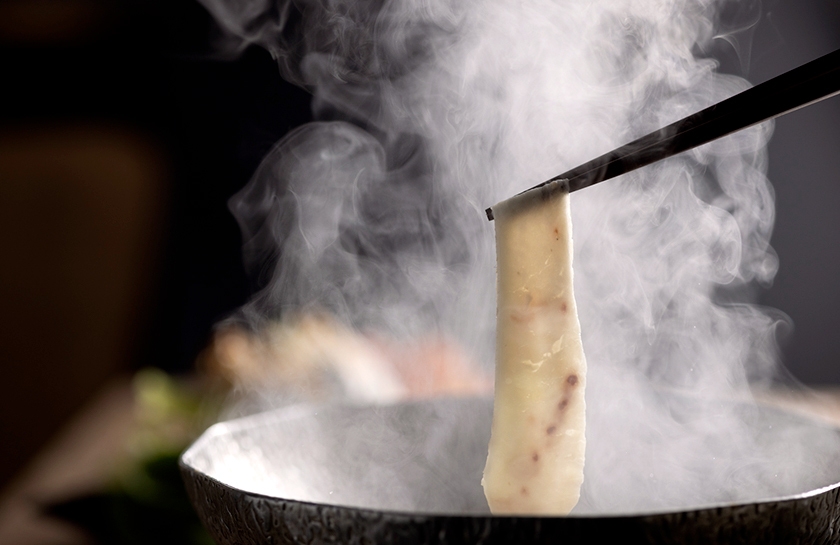 今が旬のマグロは、脂がのって濃厚な味わい。その魅力を余すことなく堪能するメニューが「マグロしゃぶしゃぶ」です。サッとしゃぶしゃぶすることで、魚の身とは思えないしっかりとした食感と、たっぷりの脂を同時に体感!厳選された10種類のキノコと一緒にいただけば、また違った風味と食感の「妙」が楽しめます。食事の最後には、「トリュフ雑炊」または「お雑煮」をお好みで。体の芯から温まる冬の美味となっております。