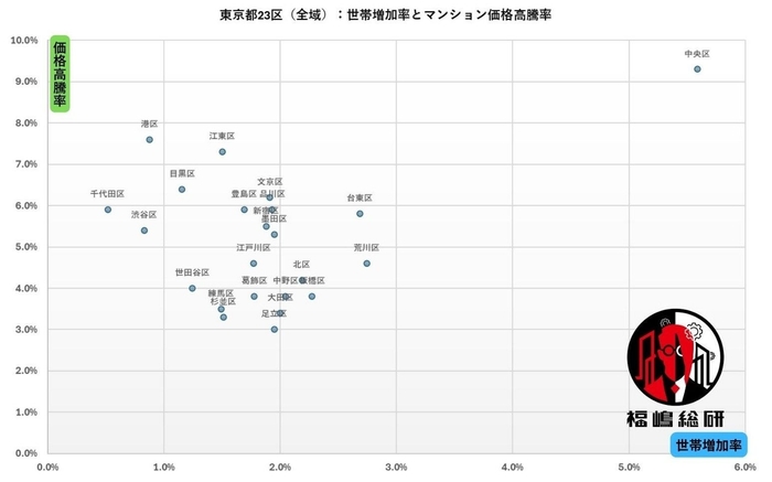 まず、以下のグラフ1では、東京都23区それぞれの「世帯増加率」と「マンション価格の平均高騰率」を散布図で示しています。