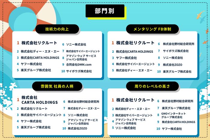 部門別ランキングでは、「技術力の向上」、「メンタリング、フィードバック体制」、「周りのレベルの高さ」の3部門でリクルートが1位を獲得。「雰囲気、社員の人柄」ではCARTA HDが1位となり、総合ランキング上位の企業が部門別ランキングでも上位に名を連ねる結果となりました。